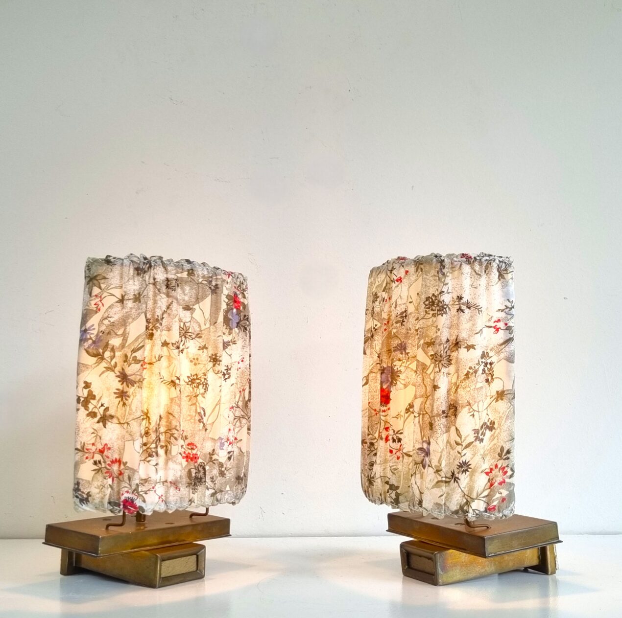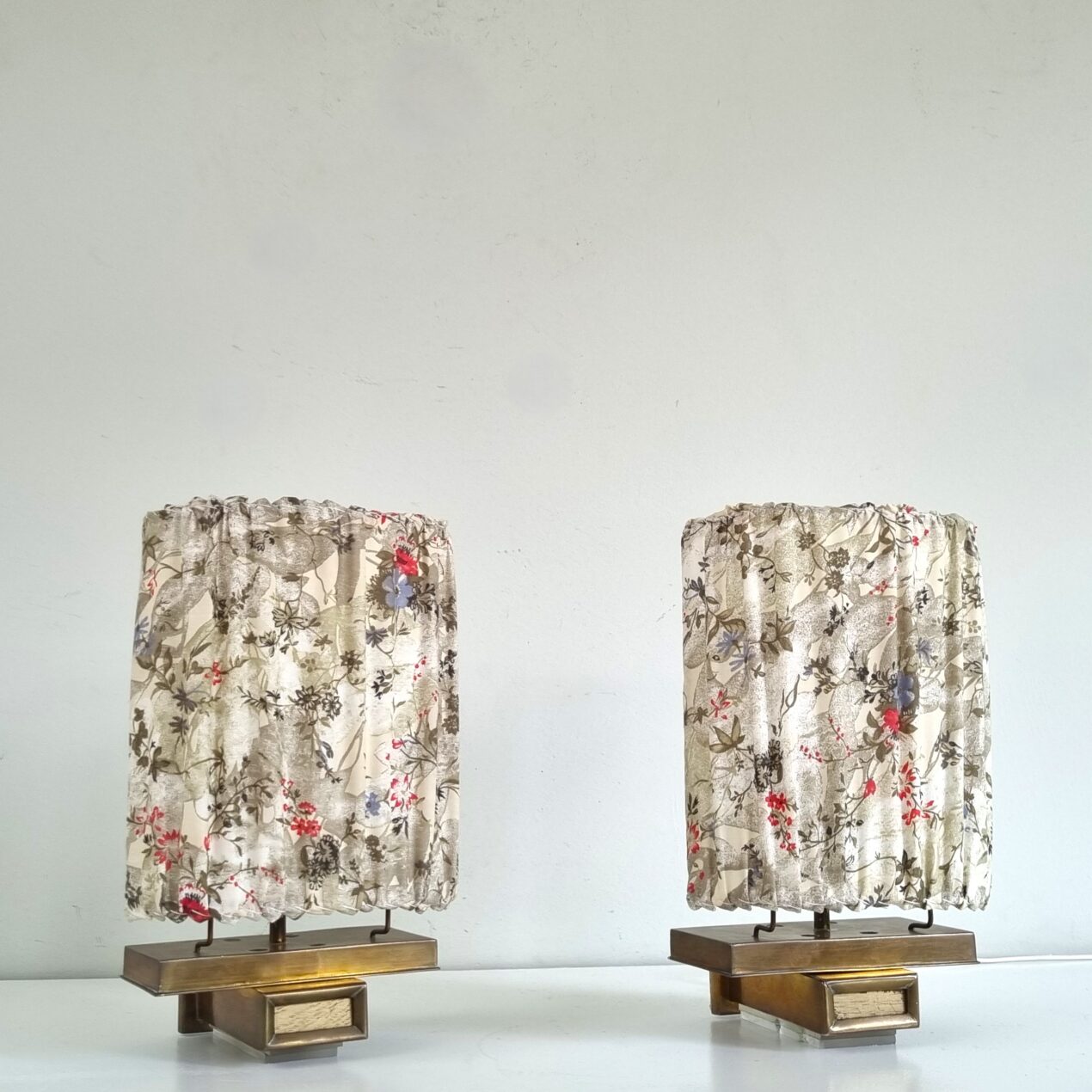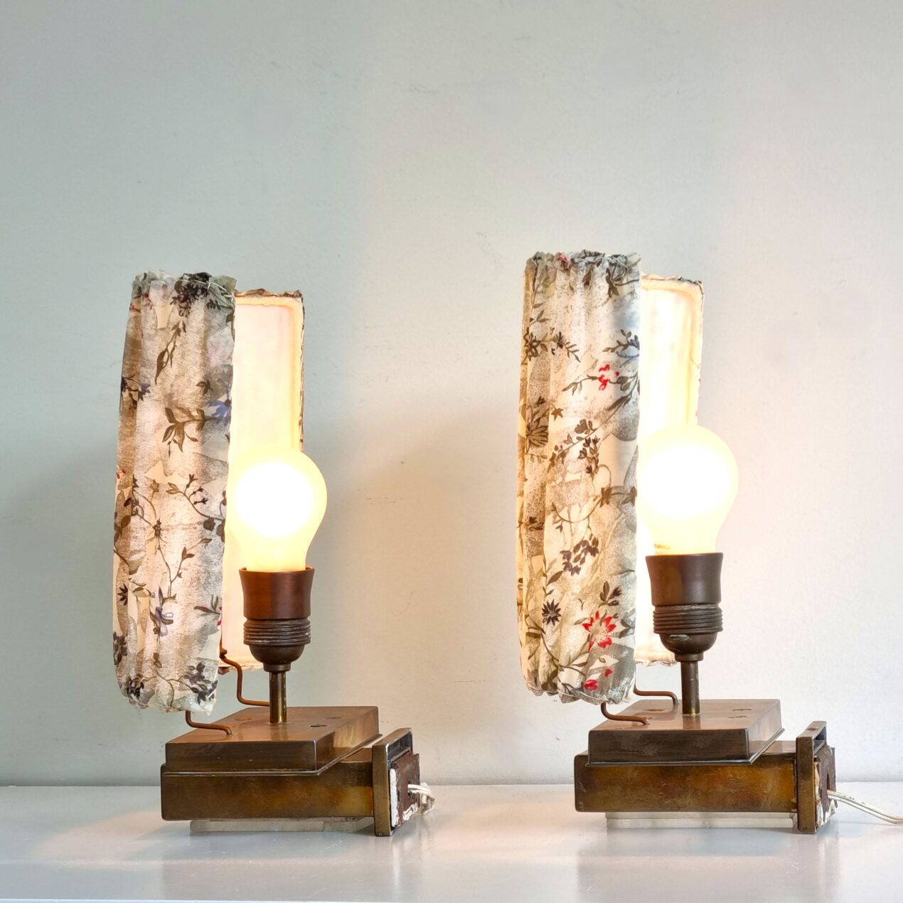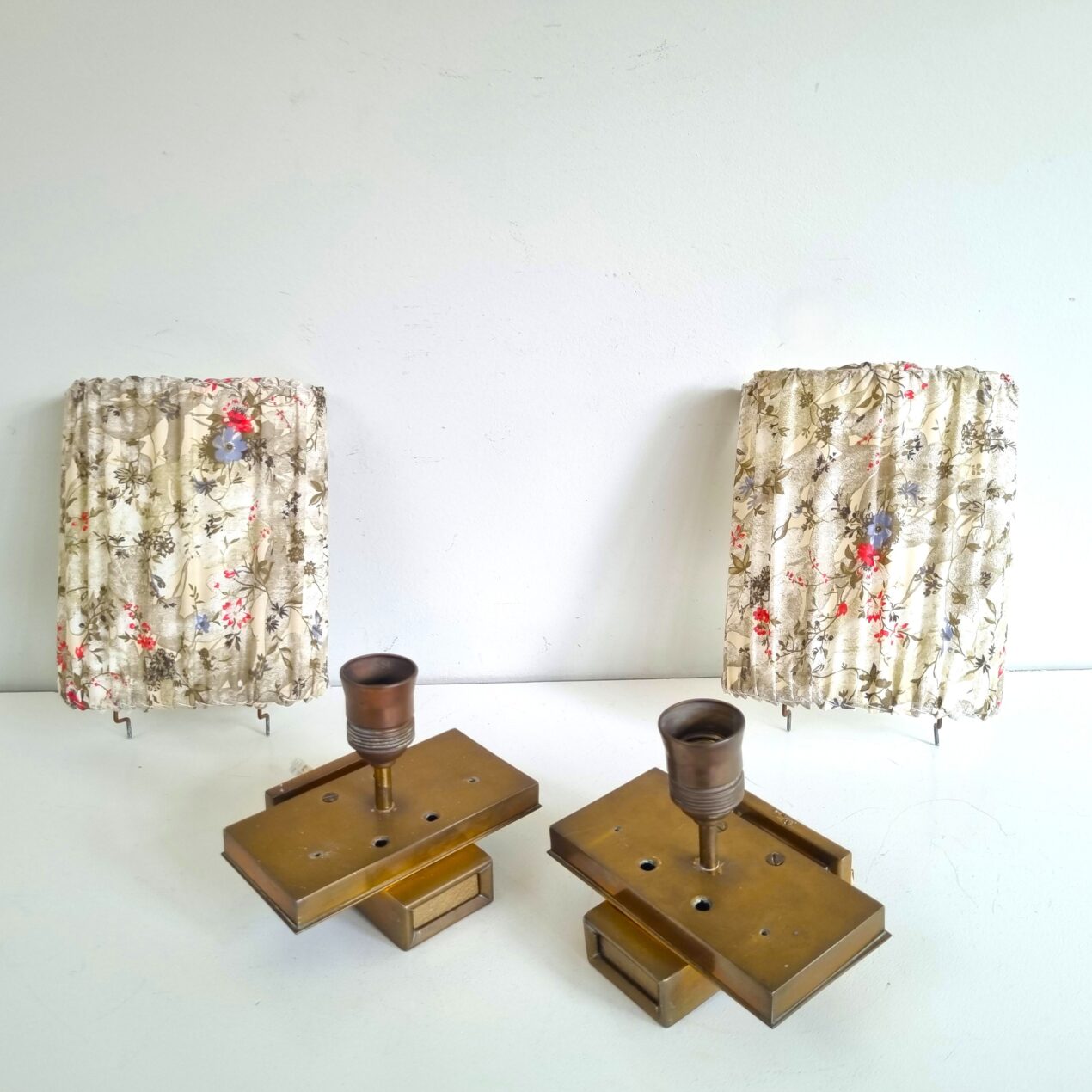 Solid brass, a small wooden detail on the frontside and two lovely fabric shades.