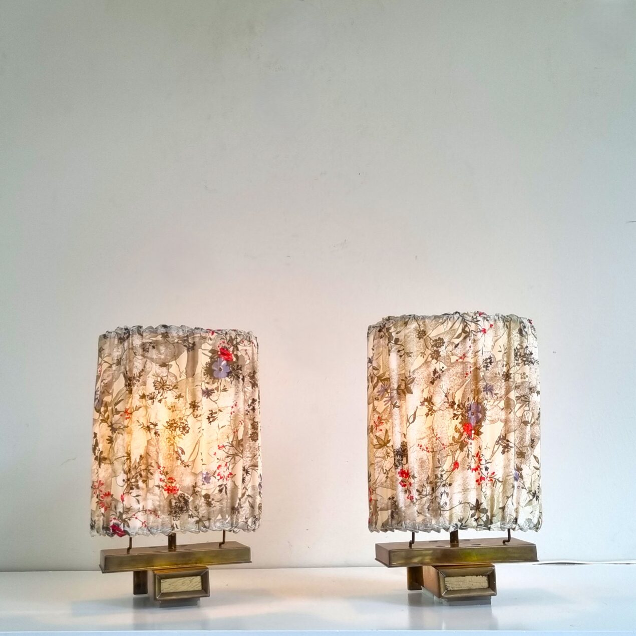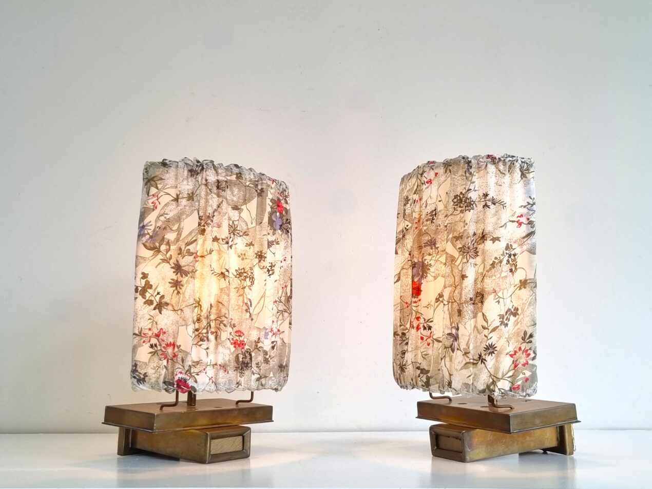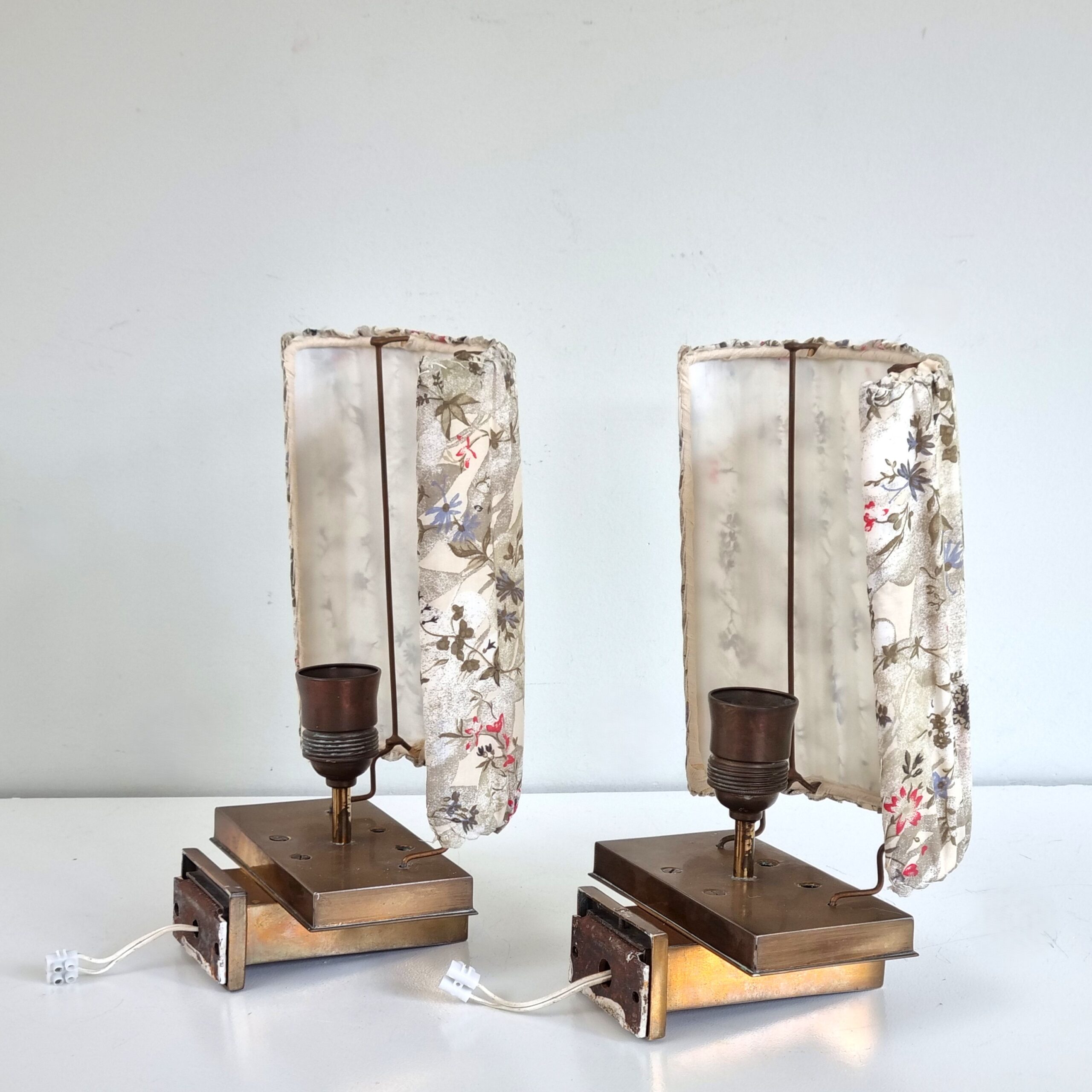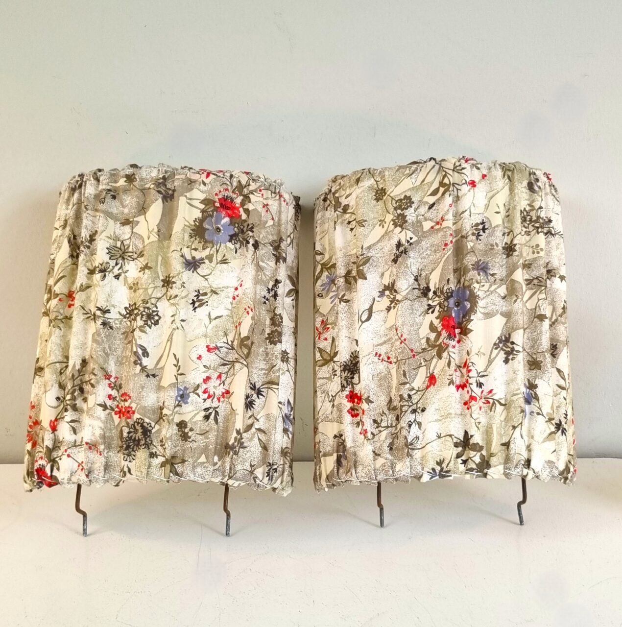 Solid brass, a small wooden detail on the frontside and two lovely fabric shades.